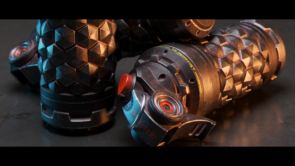 A production ready model of a sci-fi grenade with hand painted textures.